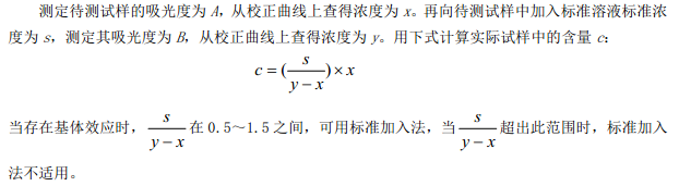 分別量取4等份量待測(cè)試樣(濃度為Cx),配制總體積相同的4份溶液。第一份不加標(biāo)準(zhǔn)溶液,第二、三、四份分別按比例加入不同濃度的標(biāo)準(zhǔn)溶液,4份溶液的濃度分別為:Cx、Cx+Co、Cx+2Co、Cx+3Co,加入標(biāo)準(zhǔn)的最小濃度Co≈0.5Cx。用空白溶液調(diào)零,在相同條件下依次測(cè)定4份溶液的吸光度值。以吸光度值為縱坐標(biāo),加入標(biāo)準(zhǔn)溶液的濃度為橫坐標(biāo),繪制校準(zhǔn)曲線,曲線反向延伸與橫坐標(biāo)的交點(diǎn)即為待測(cè)樣品的濃度。該方法只適用于濃度和吸光值呈線性的區(qū)域。待測(cè)試樣濃度與對(duì)應(yīng)吸光度值的關(guān)系見附圖A.1。