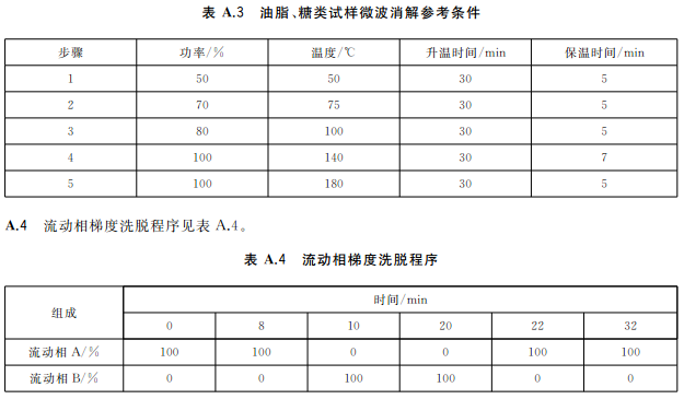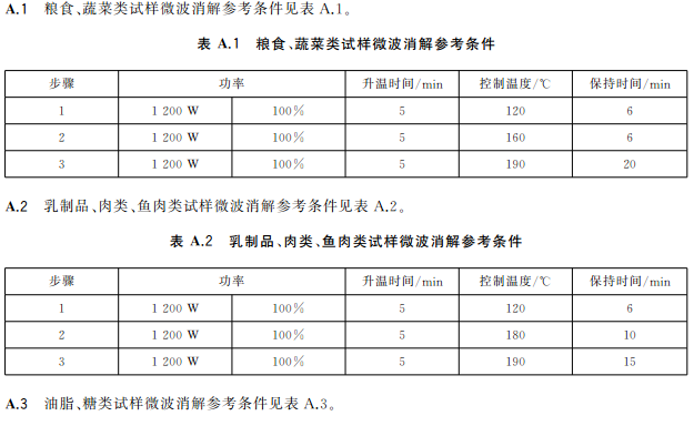 蔬菜、水果等含水分高的樣品,稱取2.0g~4.0g(精確至0.001g)樣品于消解罐中,加入5mL硝酸,放置30min;糧食、肉類、魚類等樣品,稱取0.2g~0.5g(精確至0.001g)樣品于消解罐中,加入5mL硝酸,放置30min,蓋好安全閥,將消解罐放入微波消解系統(tǒng)中,根據(jù)不同類型的樣品,設(shè)置適宜的微波消解程序(見表A.1~表A.3),按相關(guān)步驟進行消解,消解完全后趕酸,將消化液轉(zhuǎn)移至25mL容量瓶或比色管中,用少量水洗滌內(nèi)罐3次,合并洗滌液并定容至刻度,混勻。同時作空白試驗。