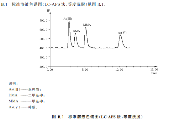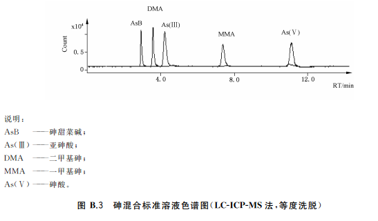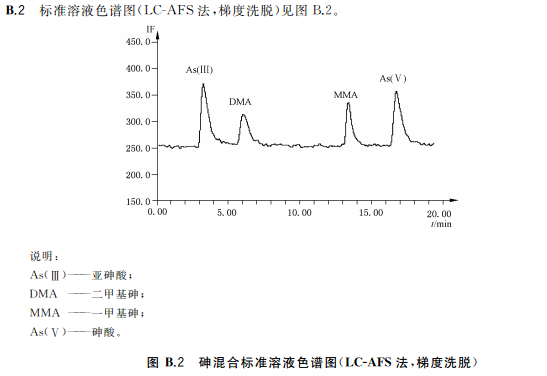 色譜柱:陰離子交換色譜柱(柱長250mm,內(nèi)徑4mm),或等效柱。陰離子交換色譜保護柱(柱長10mm,內(nèi)徑4mm),或等效柱流動相組成a)等度洗脫流動相:15mmol/L磷酸二氫銨溶液(pH6.0),流動相洗脫方式等度洗脫。流動相流速:1.0mL/min;進樣體積:100!L。等度洗脫適用于稻米及稻米加工食品b)梯度洗脫:流動相A:1mmol/L磷酸二氫銨溶液(pH9.0);流動相B:20mmol/L磷酸二氫銨溶液(pH8.0)。(梯度洗脫程序見附錄A中的表A.4。)流動相流速:1.0mL/min;進樣體積100μL。梯度洗脫適用于水產(chǎn)動物樣品、含水產(chǎn)動物組成的樣品、含藻類等海產(chǎn)植物的樣品以及嬰。