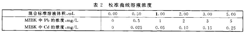 參考表2在100mL分液漏斗中加入鉛、鎘混合標(biāo)準(zhǔn)使用液(3.13),其濃度范圍應(yīng)包括試樣中鉛、鎘的濃度。然后加入1mL鹽酸溶液(3.2),加水至50mL左右,以下操作同(6.1.2)。按步驟(6.2)中的條件由低到高濃度順次測定標(biāo)準(zhǔn)溶液的吸光度。