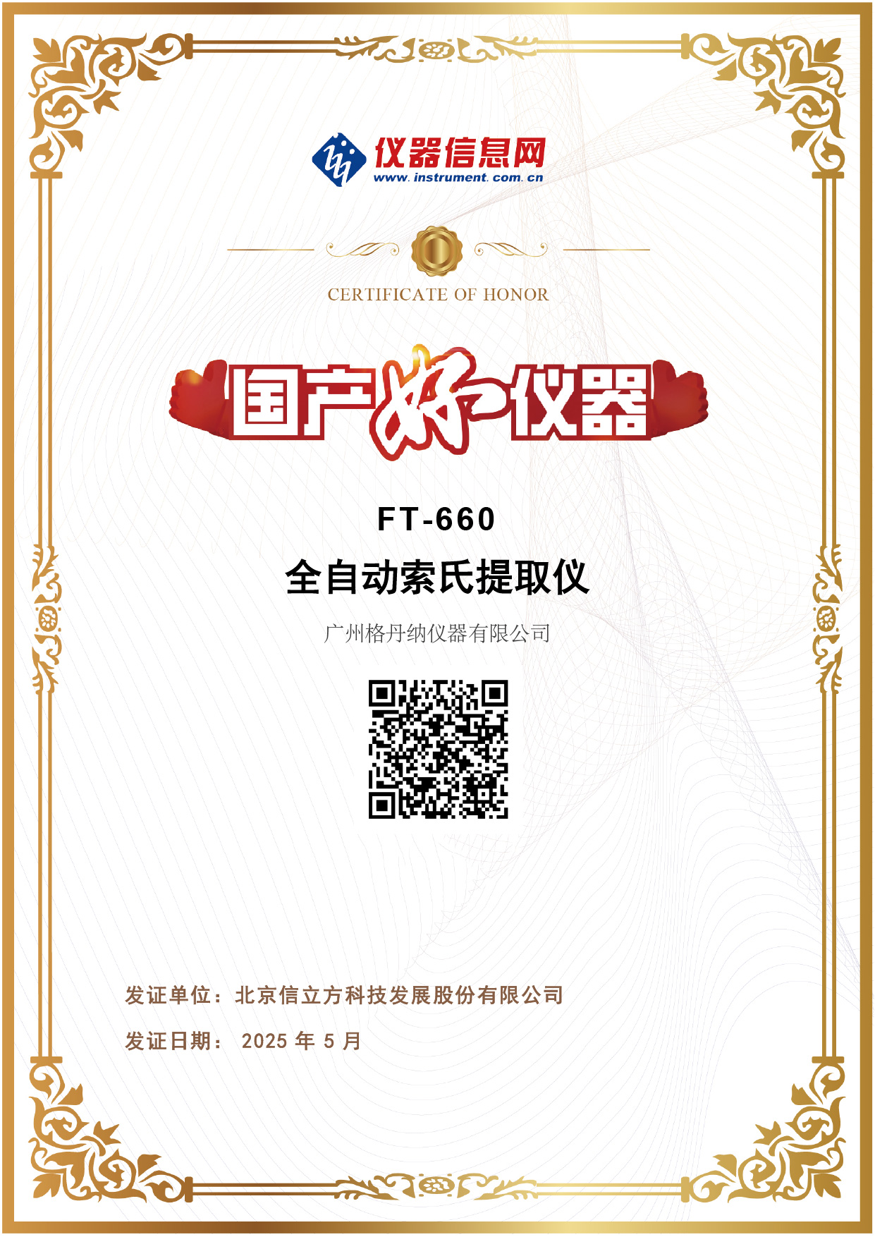 獲得《格丹納榮獲“國產好儀器”稱號-全自動索氏提取儀》