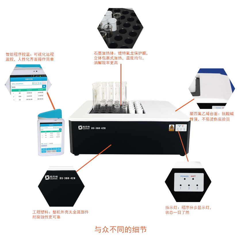 DS-360-42H石墨消解儀采用高純石墨材料作為加熱體,包裹式加熱,效率更高,溫度均勻性更好;多孔設(shè)計(jì),輕松實(shí)現(xiàn)樣品的批量處理,是您樣品消解的好伴侶。