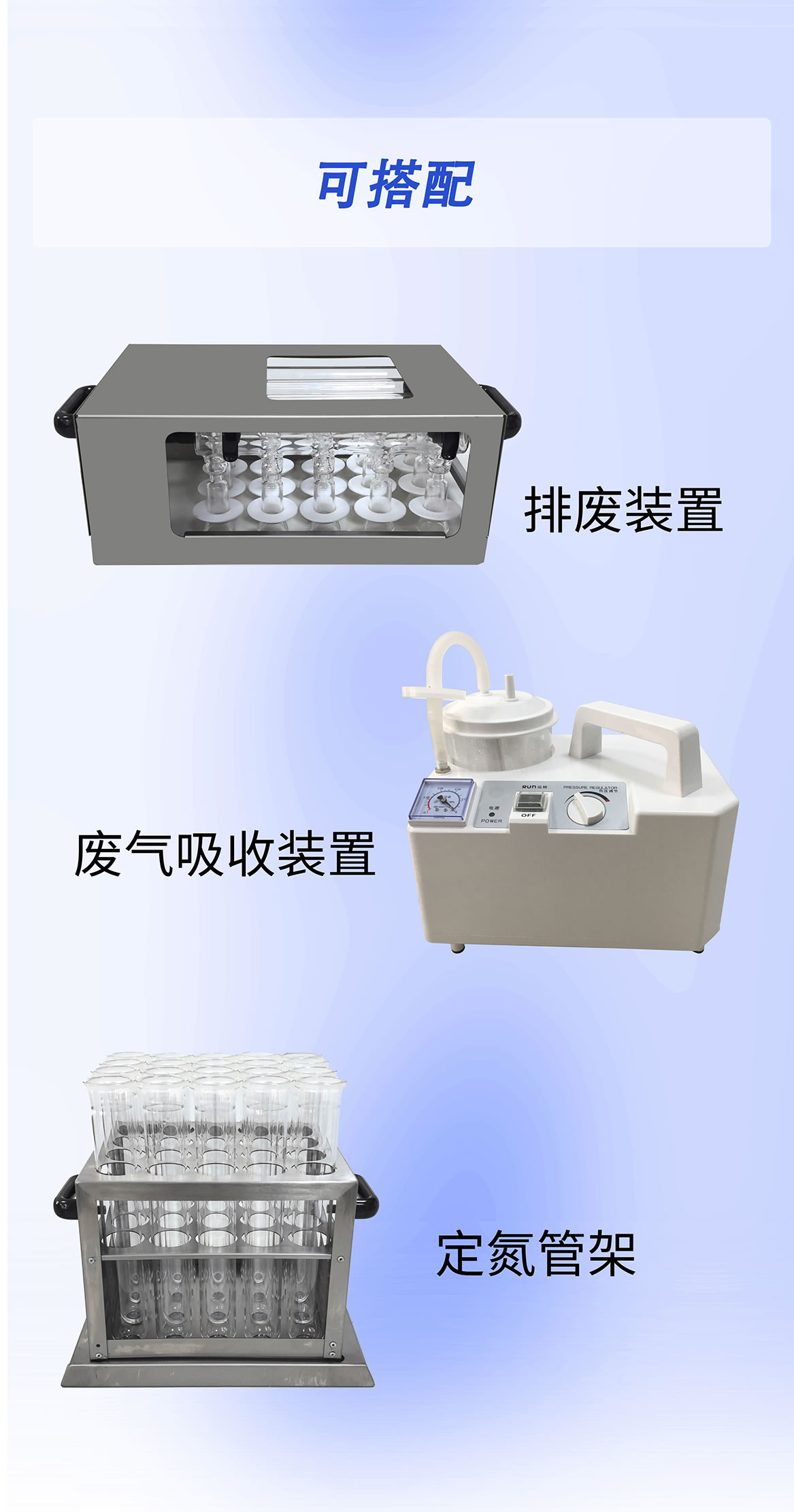 可選配廢氣吸收裝置,無需外接水流,對實驗過程中的酸性氣體、有害異味氣體進行吸附消除。
