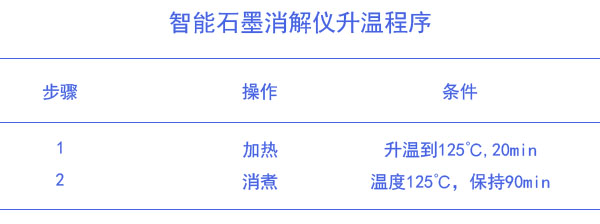 準確量取0.25g(過100目篩)土壤樣品于50mL聚四氟乙烯消解管中,加入1mL硝酸溶液、1mL鹽酸溶液及2mL氫氟酸于消解儀中,同時蓋上蓋子,置于智能石墨消解儀的石墨孔中加熱消解,通過無線遠程平板上的APP預先設置程序進行消解(消解程序見下列表)。消解樣品程透明狀態,開蓋,稍冷,然后定容至50mL。將得到的澄清液稀釋10倍作為液體樣品,待上機測定。同時做空白樣品試驗。