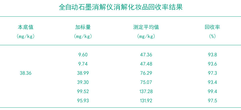 由上表可以得知,不同濃度樣品的加標(biāo)回收率均在93.4%-99.4%之間。表明此全自動(dòng)消解儀濕法消解測定化妝品中的金含量準(zhǔn)確度較好。