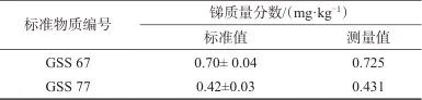 為進一步驗證方法的準確性,受標準物質的局限性,采用土壤標準物質GSS67、GSS77作為參考,各平行稱取3份,按1.4方法進行樣品處理,按照1.5方法分別測定,標準物質的標準值和測定結果見表6。由表6可知,銻元素的測定值均在證書標準值不確定度范圍內,表明該方法準確可靠。
